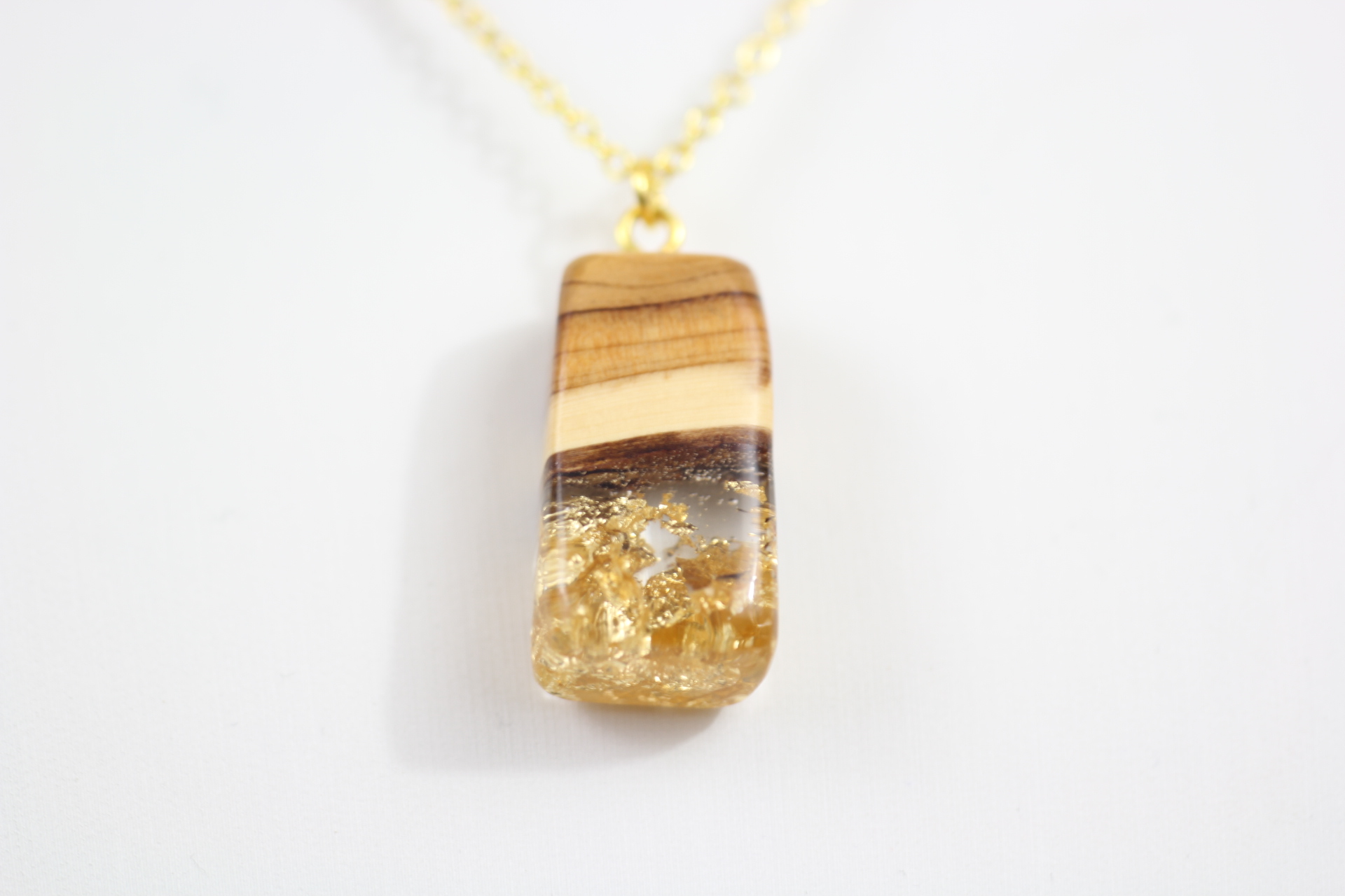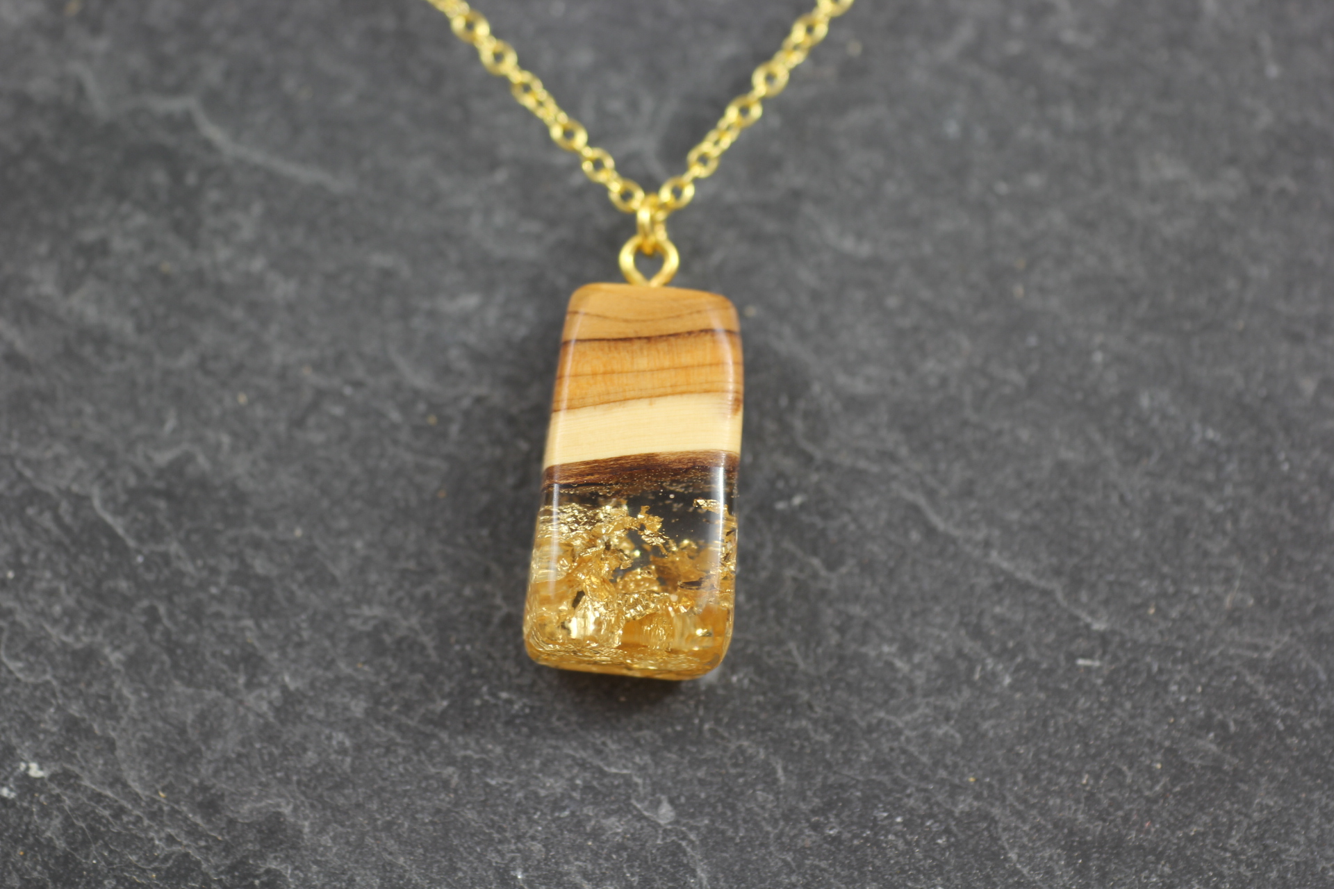Rechteckiger Anhänger aus massivem Holz und transparentem Harz mit eingearbeitetem Blattgold an einer goldenen Kette. Das Design erinnert an einen verborgenen Goldschatz unter einem Berg.